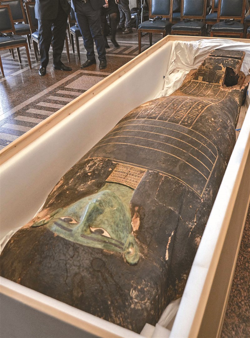 多年前失竊後被走私至美國休士頓自然科學博物館的古埃及木製石棺,二日在埃及外交部大樓內等待被移交。圖/法新社