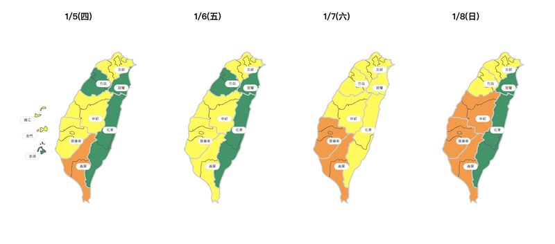 環保署監資處指出,前監測到中國上海以北、北京一帶的空汙濃度變高,隨著大陸冷氣團南下,東北風可能挾帶境外汙染物移入影響台灣。初步研判全台空品都可能受到影響,高屏地區位於下風處,汙染物易累積,西半部空品多為普通至橘色提醒等級。北部、竹苗、中部、宜蘭、花東空品區為「普通」等級;雲嘉南、高屏空品區為「橘色提醒」等級。
