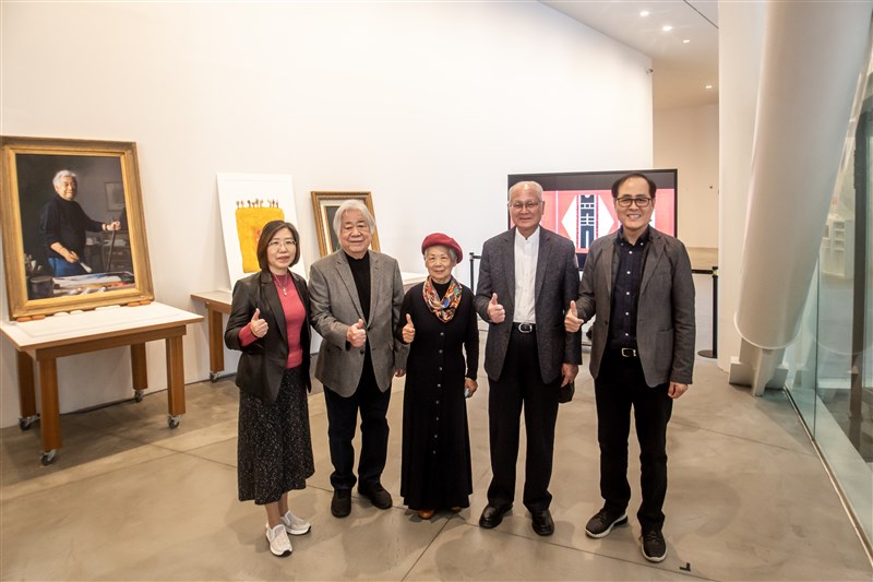 郭為美(中)、廖修平(右二)、陳輝東(左二)三位藝術家與南美館董事長蘇憲法(右)以及館長林育淳合影。圖/南美館提供