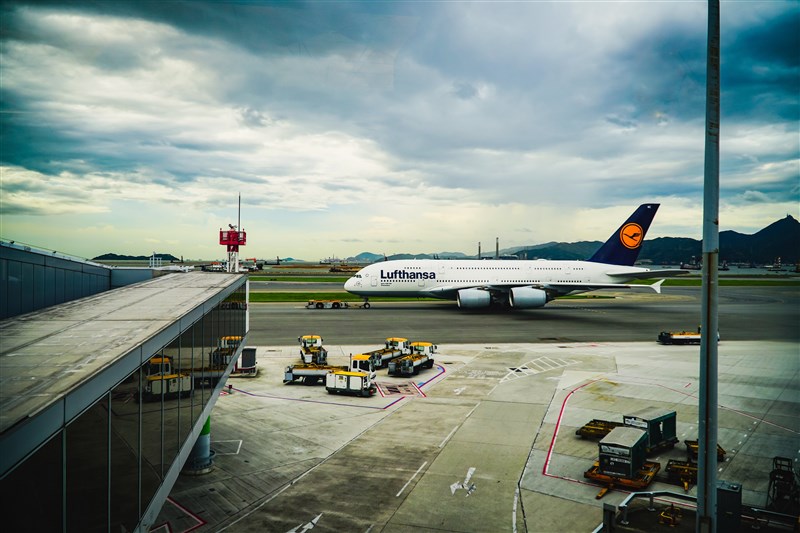 德國漢莎航空A380客機於香港赤臘角國際機場。圖/記者張睿杰
