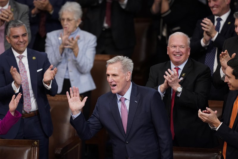美國聯邦眾議院以216票,選出共和黨領袖麥卡錫擔任第118屆國會的議長。圖╱美聯社
