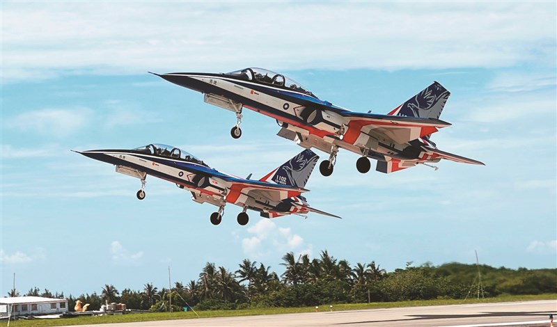 空軍勇鷹新式高教機十架進駐台東志航基地計畫,去年底如期達標,近幾天一連串密集測試、訓練,藍白紅美麗的機身畫過台東上空,來自各地的戰機迷湧現台東,捕捉勇鷹亮麗身影,昨上午終於等到「勇鷹十」畫過天空,戰機迷讚「十全十美」。圖為去年七月二架次勇鷹高教機升空展示。圖/中央社
