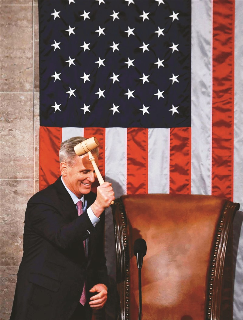 美國聯邦眾議院議長當選人麥卡錫,七日象徵性拿起議事槌。圖/法新社
