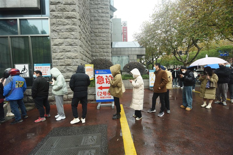大陸病毒學專家警告,開放入境後或現第二波新冠感染高峰。圖為浙江杭州醫院外面,民眾大排長龍。圖/法新社