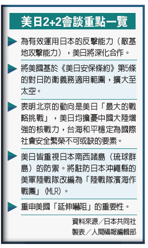 【本報綜合外電報導】美日外交與國防部長「2加2」會談十一日在華府舉行,會後共同宣布將駐紮在沖繩的美軍陸戰隊改編為具有情報、偵監、反艦和運輸能力的「陸戰隊濱海作戰團」,布林肯表示,雙方同意「中華人民共和國是美日及盟友面對的最大戰略挑戰」,會中討論解放軍在東海、台海和南海的破壞穩定行徑。