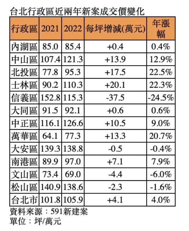 北市寸土寸金 這3區房價年漲幅達2成 |2023.01.13 語音朗讀 1746觀看次 字級 大 中 小 北投、士林及萬華成為北市房價「搖滾區」,一年間每坪成交單價至少增加超過10萬元,年漲幅都保持在2成以上。圖/中央社 【本報台北訊】台北市寸土寸金,新房子動輒天價,據591新建案統計,北市2022年行政區的新案成交單價,全市仍是漲多跌少,平均每坪單價105.9萬元,年增4%,若以行政區來看,北投、士林及萬華成為北市房價「搖滾區」,一年間每坪成交單價至少增加超過10萬元,年漲幅都保持在2成以上,信義區則是年減24.5%,跌幅最大,每坪交易單價重挫近40萬元。591新建案指出,以這次漲幅最明顯多的北投及士林兩地來說,受天母周邊高價建案加持,士林近年房價漲幅仍維持強勁,而北投過往受限地理位置,房市關注度有限,不過近年搭上北士科園區議題,陸續吸引品牌建商進駐,像今年已有「國泰雍萃」、「華固上文林」等指標案公開銷售。根據預售屋實價登錄揭露,兩案單價都已站穩百萬大關,隨著更多新案進場,估計將為當地房價創造另一波漲勢。圖/中央社另外,北市中山、中正等蛋黃區,因推案熱絡、加上小宅崛起,也讓每坪行情也穩定維持在百萬元水位,相形之下,信義、松山等高價區,則出現價跌。全球居不動產情報室總監陳炳辰認為,北市跌幅較大的區域,主要是因為推案量少,價格就容易拉高或拉低,所以一旦交易量減弱,又沒有高價亮點就走弱了,尤其是信義區、大安區這種指標區,有指標豪宅進場時,價格會衝的特別高,但今年在打房、升息等影響下,未來豪宅量能走弱,也將影響區域平均價格。展望後況,陳炳辰認為,今年房市走冷,但出於登錄揭露的時間因素,或是個案拉抬,以及建商行銷價格操作方式,房價與市況脫鉤,若未來新案價跌,也實屬合理現象,預期北市今年房價下跌一成左右。圖/591新建案 前一篇文章 千年古籍復刻重現! 宋刊本《妙法蓮華經》 誠品書店獨家登場 下一篇文章 春節換新鈔 今起至19日僅5天充分供應 熱門新聞 01【遨遊藝事】巴黎 黛瑪兄弟茶館(Dammann Frères)2026.02.0602向前有路 光明在望2026.02.0503極樂寺彩繪燈籠 三好理念廣傳校園2026.02.0404佛教藝文本土化 昆士蘭美術館團隊訪中天寺2026.02.0505兩岸新聞營師生 認識人間佛教2026.02.050630冊佛教徒必讀經典 台北書展亮相2026.02.0407南韓城南高中、普中 棒球隊切磋球技2026.02.0408印尼佛教學院開學 培育國際弘法僧才2026.02.050910年前震倒115死 台南維冠改建防震7級大樓2026.02.0610立春養生疏肝理氣 飲食調養少酸多甘2026.02.04 訂閱電子報 台北市 天氣預報 台灣一週天氣預報 相關報導 美擬再對台軍售 金額6千億後備軍人教召 改為14天政院:晶片先進製程 我仍領先蕭旭岑會王滬寧 強調一中各表蕭:兩岸合作賺世界錢國共論壇登場 藍:兩岸露暖意