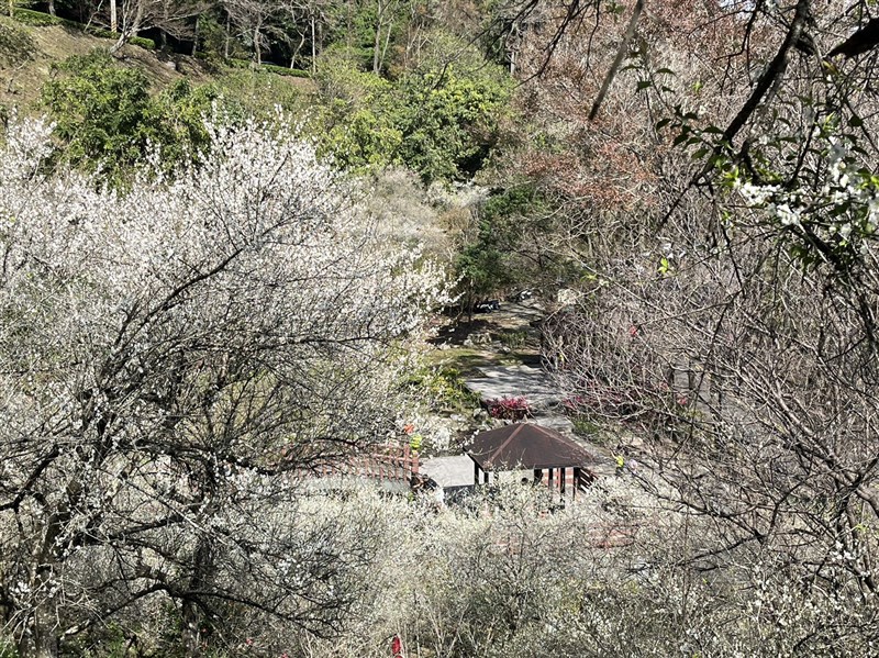 郭耀程說,民眾可到溪洲公園、中線及高線附近的步道及槭林公園觀賞盛開的梅花,漫步在梅花朵朵開的步道間,清新的空氣蘊含著清雅的梅花香,有如人間仙境,美不勝收。還有秋葉楓紅的景緻,交錯著宛如白雪的梅花,別有一番詩情畫意的景象。