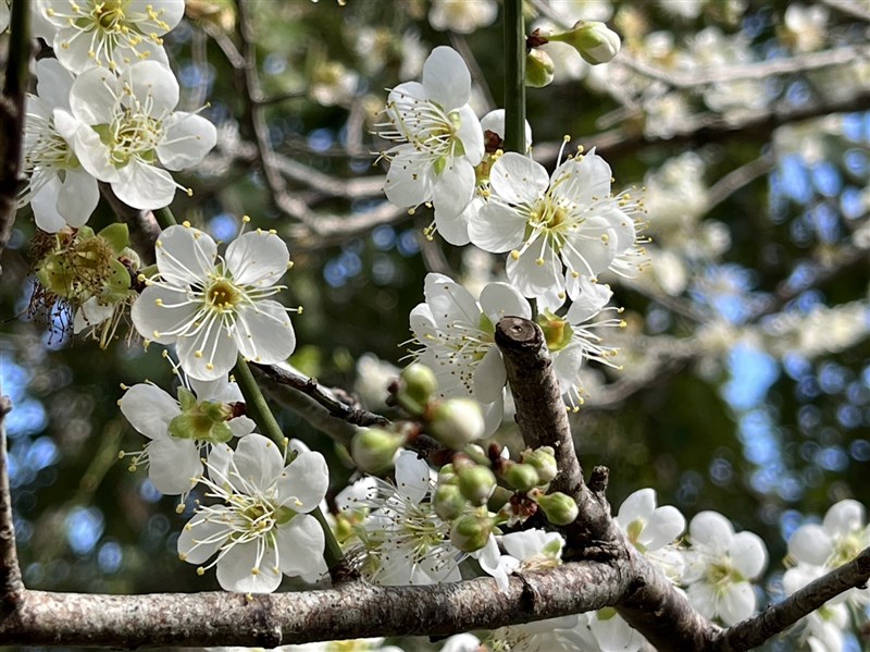 石門水庫園區內種植的300棵低海拔略梅樹有近40年的歷史,愈冷愈開花,目前園區梅樹的白色小花朵,已掛滿枝頭相繼怒放,花況已開8成;北區水資源局副局長郭耀程表示,根據氣象預報,還會有一波冷氣團,不過會挾帶一點雨,但預估不至於會讓花瓣都被打落,因此良好花況應可維持至春節。