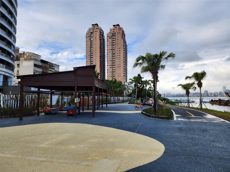 考量到此區位於八里左岸自行車道的中心點,也設置可坐、可躺的高架木棧道,讓民眾能短暫休息,在優美的景色下放鬆、補充精力後再前往下一個目的地。木棧道的形狀也配合關渡大橋的弧形,相互輝映下成為全新的打卡景點。