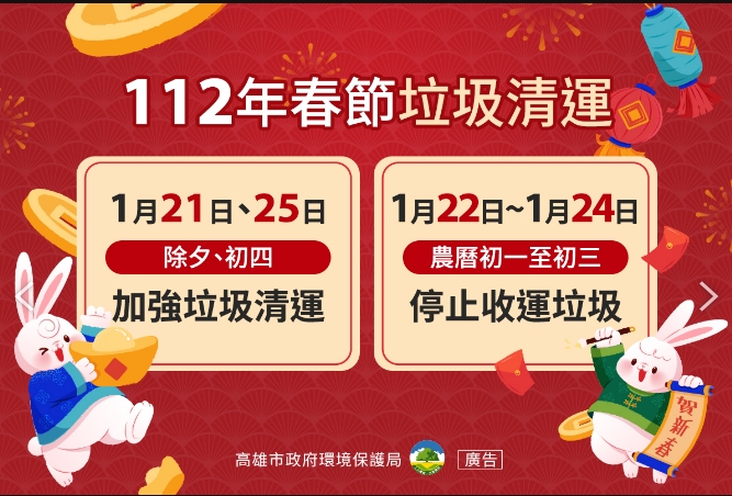 環保局長張瑞琿指出,原本高雄市周三停收垃圾,今年大年初四(1月25日)適逢周三,春節期間加強服務,各區清潔隊除白天起加強清運垃圾外,特依原清運路線加強夜間清運。相關訊息可以上環保局官網「春節清運專區」查詢。