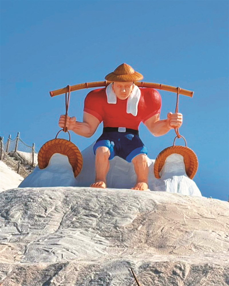 【記者江俊亮台南報導】七股鹽山新年裝置藝術〈鹽擔下的獨白〉,首度以台灣鹽工為主角,在鹽山上樹立一尊高五點六公尺、寬七點三公尺的鹽工塑像,象徵鹽工「不忘本、不畏困難」堅毅精神,在貧瘠的鹽地,耕耘出西南沿海的「白金傳奇」。