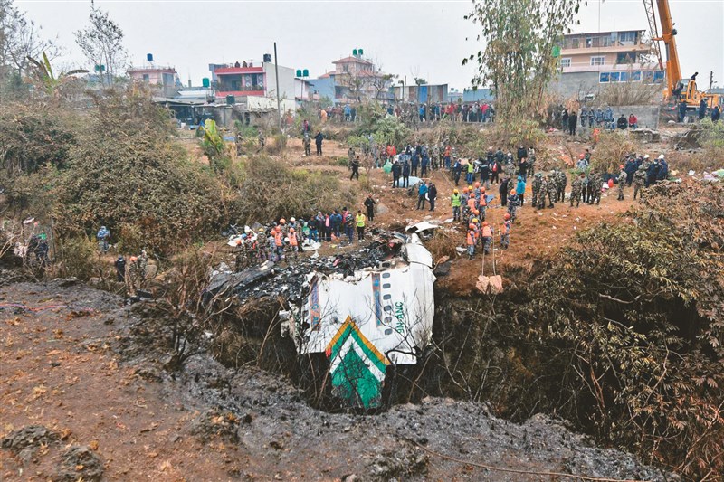 尼泊爾十五日發生空難,搜救員十六日在現場調查墜毀客機殘骸。圖/法新社