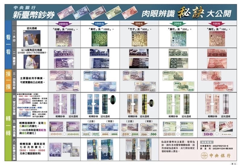 他同時公布近期在市場查緝的「玩具鈔」與「仿真玩具鈔」,後者常見號碼包括,100元的CQ281880VJ、1000元的HR484268XD、500元的DR663080VA、2000元的GM580370UH。他同時公布「6招辨識真鈔」的撇別,包括水印、隱藏字、凹版印紋、窗式安全線、變色油墨、光影變化箔膜。