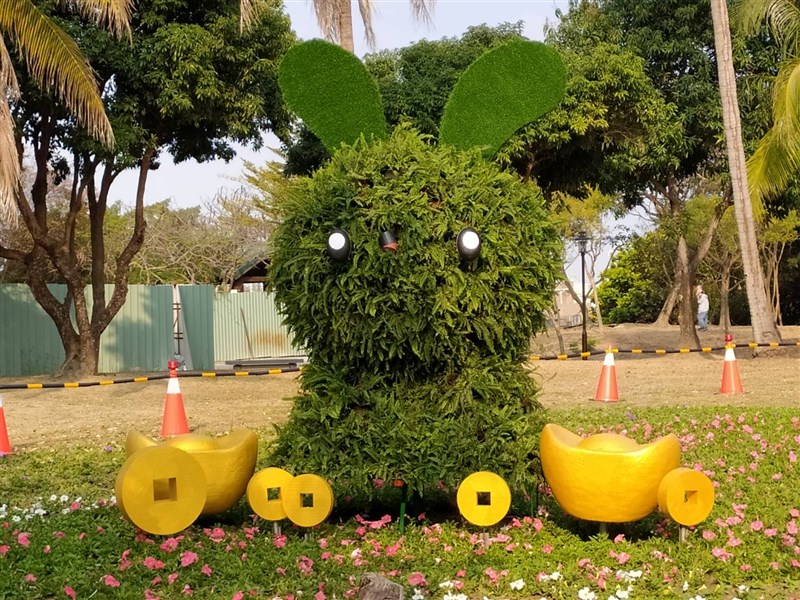 台南市永康公園「錢兔似錦賀新禧」花卉藝術裝置開箱,錢免令民眾目光為之一亮。圖/工務局提供