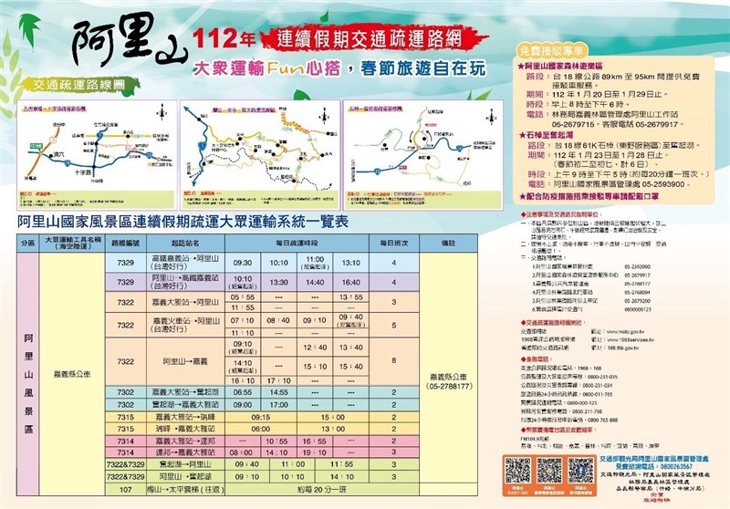 春節疏運 奮起湖、阿里山免費接駁看這裡 |2023.01.18 語音朗讀 2491觀看次 字級 大 中 小 春節假期暢遊嘉義阿里山,阿管處今已啟動阿里山地區春節疏運計畫。圖/阿管處提供 【本報嘉義訊】春節將至,阿里山國家風景區管理處已啟動阿里山地區春節疏運計畫。阿管處指出,因應今年10天春節連假大量遊客湧向大阿里山地區,造成交通壅塞,辦理免費接駁專車、相關管制措施及優惠措施等各項疏運措施。免費接駁專車服務部分,阿管處與嘉義林管處提供2條路線,石棹-奮起湖線:石棹(台18線61k樂野服務區旁)至奮起湖(第三停車場),期間為1月23日(初二)至1月28日(初七),上午9時至下午5時,雙向對開。圖/阿管處提供阿里山森林遊樂區線:台18線89K-95K間至阿里山森林遊樂區,期間為1月20日至1月29日,上午8時至下午6時,共10個接駁點。另「台灣好行」阿里山線、瑞里線及太平雲梯接駁公車均有機動加開班次。相關管制措施部分,1月23日(初二)至1月28日(初七)上午8時至下午5時,石棹至奮起湖採單向行車管制,小型車去程由台18線63.5k經頂石棹輔助道路至169縣道前往奮起湖;回程走169縣道銜接至台18線。相關優惠措施部分,太平雲梯:凡搭乘梅山往太平公車憑公車處乘車證明單享有門票折抵20元。鄒族逐鹿文創園區:1月22日(初一)至30日(初九)文創園區免費入園。阿管處新春遊程建議路線,遊客可避開壅擠人車潮,由國道三號經竹山/南雲交流道下後,由台3線經草嶺轉149甲縣道,可通往來吉、太和、豐山等地區,體驗原住民部落及質樸的農村文化,漫步茶鄉之餘更能欣賞美麗的櫻花。阿管處提醒,山區氣候變化劇烈,常有氣溫驟降情形,上山的旅客事先預訂住宿及攜帶足夠禦寒衣物,以免著涼受凍。購買優待門票進入森林遊樂區,請攜帶相關證件接受查驗。也請多利用公共運輸工具,若開車請出發前檢查及保養交通工具,避免於山區中拋錨。嘉義阿里山鄉豐山村滴水成水。圖/阿管處提供嘉義梅山鄉太和村台版比薩斜塔振興宮。圖/阿管處提供 前一篇文章 和平島雨季新玩法掀風潮 串連湖海灣及情人湖 下一篇文章 木板圍籬材料大驚奇!全是回收舊衣做的 熱門新聞 01動物的精采瞬間(上)2026.02.0802【遨遊藝事】巴黎 黛瑪兄弟茶館(Dammann Frères)2026.02.060310年前震倒115死 台南維冠改建防震7級大樓2026.02.0604台北書展 佛光山拉近佛與讀者距離 看得懂用得著 佛教徒必讀經典重磅獻禮2026.02.0705王德瑾 願做有溫度的藝術家2026.02.0706加拿大祈禱早餐會 跨信仰凝聚共融2026.02.0907【生活智人154】英國作家皮可‧艾爾 面對紛擾 以靜制動2026.02.0708新加坡佛光山三好樓 扎首樁開啟弘法新頁2026.02.0609【營養專欄】聰明選豆,吃出植物性營養新高度!2026.02.0710福山寺送暖 福田戶投鉢植福2026.02.07 訂閱電子報 台北市 天氣預報 台灣一週天氣預報 相關報導 電梯按鍵怎麼取消? 網友指出還有這招基隆和平島阿拉寶灣5月開放 即日起可網路預約北捷引進南韓樂鐵電聯車 乘車空間更寬敞屏東藝起派對移師潮州 寫生比賽29日截止報名閒置多年轉型 花蓮鳳林新露營地4星高規格新景點「樹鼠」? 台南安平樹屋標成「tree mouse」