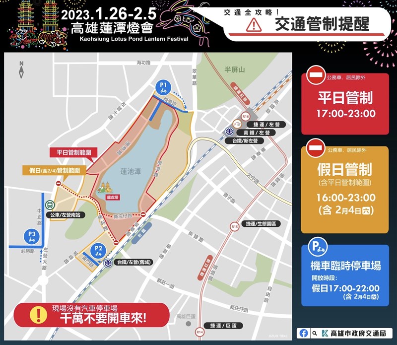 市府另闢機車停車場於蓮潭與明潭路、東門路、左營中正路與必勝路設置3處臨時停車場。交通局提醒賞燈民眾務必停妥以確保遊客步行安全,屆時警方也會加強違規拖吊取締。