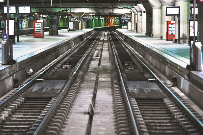 法國工人十九日發動全國性罷工,抗議總統馬克宏計畫將法定退休年齡延後兩年至六十四歲,巴黎塞納河左岸的蒙巴納斯站月台當天空蕩蕩。圖/法新社