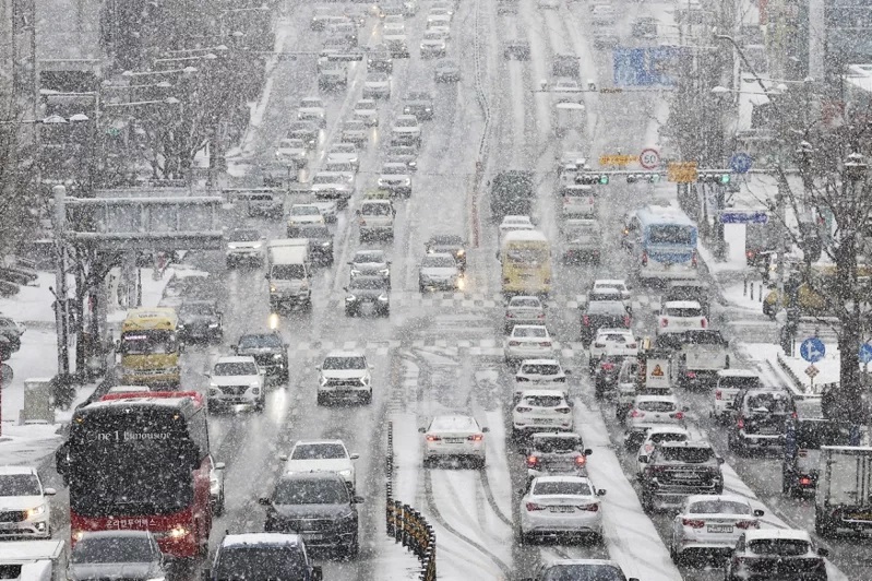 南韓水原市26日下起大雪。圖/美聯社