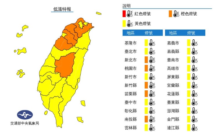 氣象局並發布低溫特報,清晨輻射冷卻影響,台灣各地及澎湖、金門、馬祖早晚天氣非常寒冷,易有10度以下氣溫;今晨至白天新北、桃園、新竹、苗栗、南投有連續10度或6度以下氣溫發生。