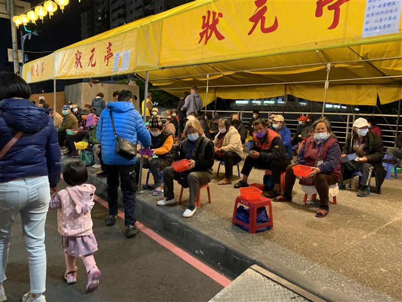 為免接受布施的民眾散落各角落失序,玉皇宮特別搭設「狀元亭」並提供板凳讓他們休息,也發給餐盒;尤其還要求他們出具疫苗施打黃卡做證明再發給識別證。