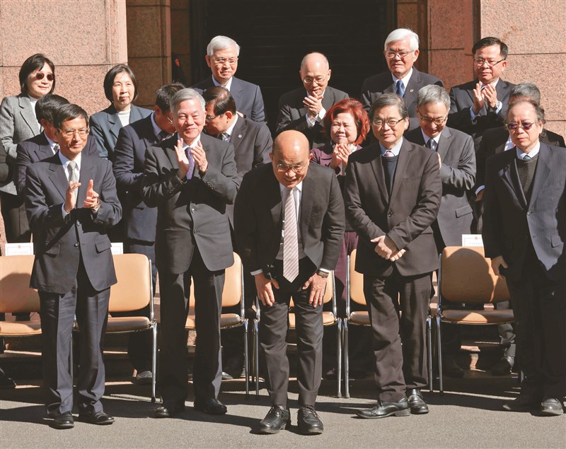 蘇貞昌昨依往例,在總辭後與閣員合影留念,部會首長在蘇步至行政院中央大樓廣場時兩度鼓掌,蘇揆全程展露笑容,顯得十分輕鬆,並向在場人員拱手鞠躬致意。