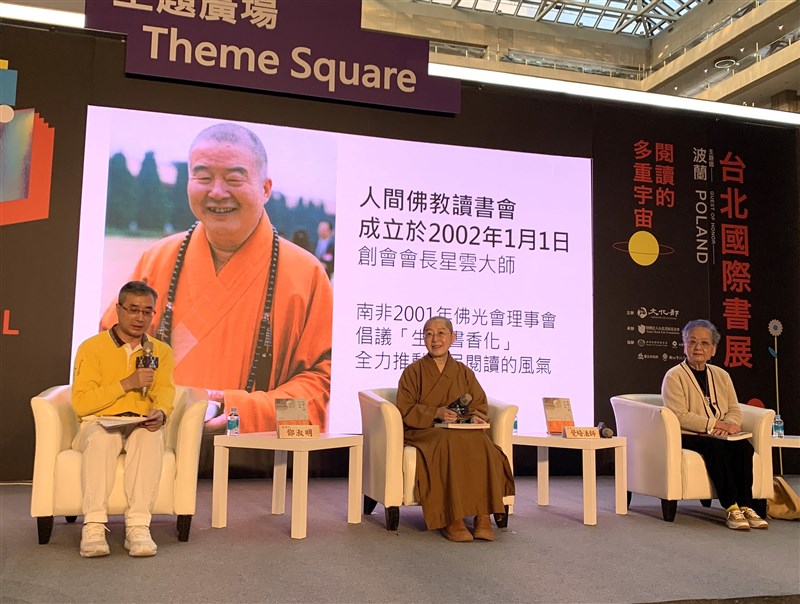 2023台北國際書展今(31)天熱鬧開幕,佛光山在主題廣場舉辦一場《悅讀人間好滋味》新書座談會,由國際佛光會祕書長覺培法師,與台灣PHP素直友會會長簡靜惠暢談「人間佛教讀書會」成立20周年故事,左為主持人、人間佛教讀書會台灣區執行長鄧淑明。圖/記者曹麗蕙