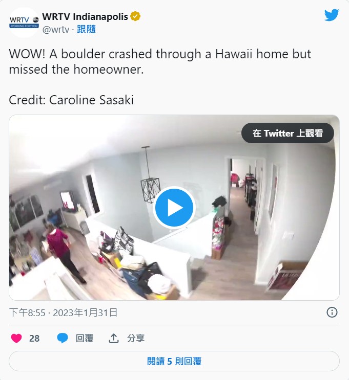 巨石撞穿牆!女子驚險避死劫監視器全都錄 |2023.02.01 語音朗讀 1225觀看次 字級 大 中 小 美國夏威夷州檀香山居民佐佐木,日前在自宅差一點點就遭穿牆而過的巨石擊中,驚險瞬間家中監視器全拍了下來。圖/twitter WRTV Indianapolis 【本報綜合外電報導】赫芬頓郵報1日綜合當地報導,美國夏威夷州檀香山的65歲居民卡羅琳.佐佐木(Caroline Sasaki)日前在自宅差一點點就遭穿牆而過的巨石擊中,這驚險一瞬間都被她家中的監視器拍了下來。根據「Hawaii News Now」說法,這起事件發生在1月29日晚間11時45分左右。佐佐木告訴該台記者,當時快要午夜了,她正走向客廳的沙發要看電視。從監視器影像可見,佐佐木驚險地避開了撞破新家牆壁的巨石。消防局表示,這塊巨石的高度與寬度均約1.5公尺,先撞破了佐佐木家的煤渣磚牆(cinderblock wall),接著衝過客廳跟另一面牆壁,最後終於在臥室停了下來,還有一輛汽車受損,但值得慶幸的是,當時在家的4人都沒有受傷。佐佐木事後受訪時回憶,自己聽到了巨大的轟隆聲,「顯然,巨石就在我的眼前穿過去了,而我當時並不知道」。她說,「我沒看到石頭,我只聽到了轟隆聲,然後就是有人問我是否沒事」。佐佐木稱自己仍對整件事感到震驚,也拒絕收看當時的影像,「所以我…我不確定有多近,但大家都跟我說,我很幸運」。佐佐木指出,有人告訴她,要是自己「再走一步」,她「可能就不會在這裡了」。據報導,佐佐木和鄰居懷疑,巨石掉落的原因出在她家附近一座山上的計畫建案挖掘作業,檀香山市府則仍在進行調查之中。圖/twitter WRTV Indianapolis 前一篇文章 無薪假增994人 製造業占半數 下一篇文章 小花蔓澤蘭將啟動收購 南投加碼鼓勵參與 熱門新聞 01【傳燈六十‧百年仰望】星雲大師一筆字書法紀念特展概述2026.01.3002澳網 辛納拚3連霸 小蠻牛盼全滿貫2026.01.3003土方之亂推高成本 房價漲壓浮現2026.02.0204【紀實攝影】花蓮月光寺 台灣後山的人間淨土2026.02.0105佛光山大雄寶殿 逾千僧信迎萬佛2026.02.0106針灸醫療 助癱瘓大象站起來2026.01.3107沙漠獅變海洋獅 為人類上了一課2026.02.0108【詩】清晨的籤詩2026.01.3009【人間行者心】一鏟一撬,心路通行2026.02.0110淨心是最好的預防醫學 洛桑加參:找回不生病的力量2026.01.31 訂閱電子報 台北市 天氣預報 台灣一週天氣預報 相關報導 寵物掌印斗方 DIY超萌春聯月津港燈節 周末登場限用洗選蛋 連鎖餐飲店喊漲價北橫櫻花季 跟著地圖散步AI引發3C通膨 桌電、手機掀漲價潮土方之亂推高成本 房價漲壓浮現