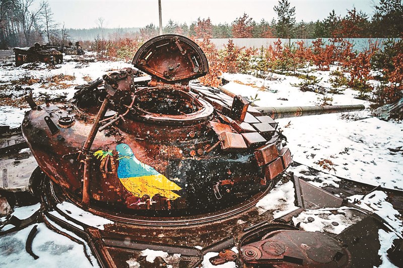 義大利街頭藝術家Tvboy在基輔郊區被摧毀的俄軍坦克,畫上烏國國旗配色的和平鴿。圖/法新社