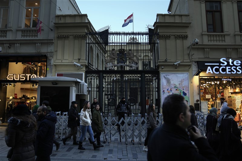 2月2日,人們經過位於伊斯坦布爾的荷蘭總領事館的守衛入口。圖/美聯社