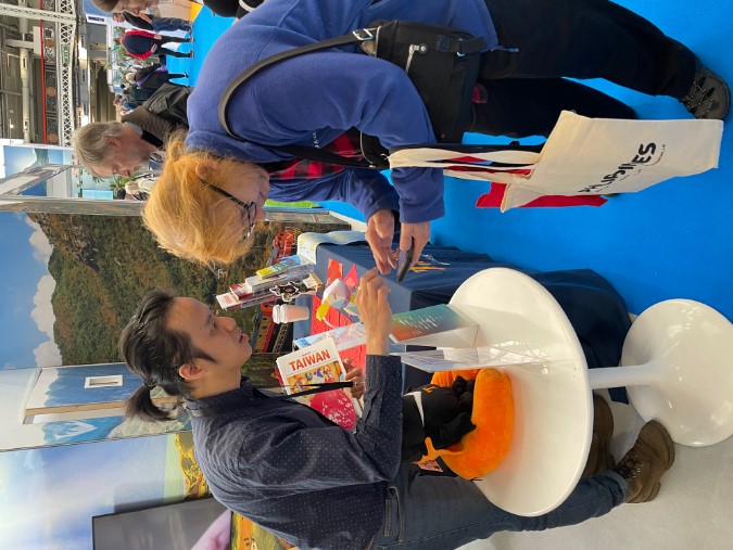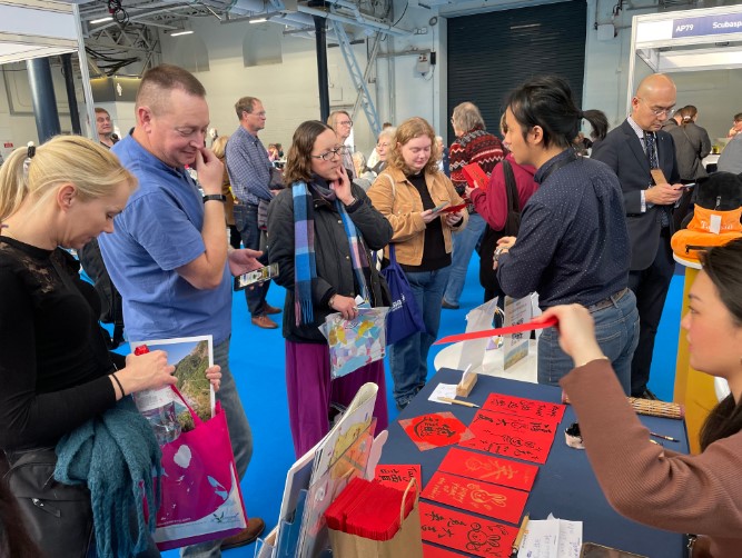 除了旅遊諮詢,台灣館還舉辦書法體驗、打卡送台灣燈會兔年提燈等活動。圖/觀光局駐倫敦辦事處提供