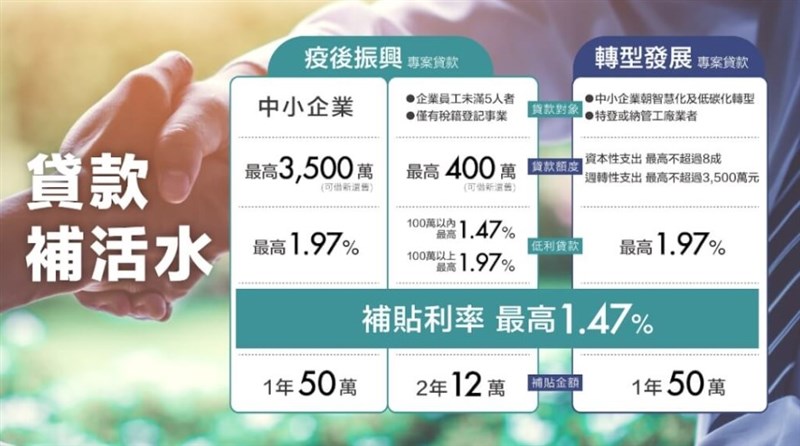 經濟部說明,相關方案是對於有資金需求廠商提供流動性營運資金,對於投入轉型的中小型業者提供資本及周轉性支出的貸款,協助中小型事業在疫後振興期間,提升競爭力並恢復營運榮景。
