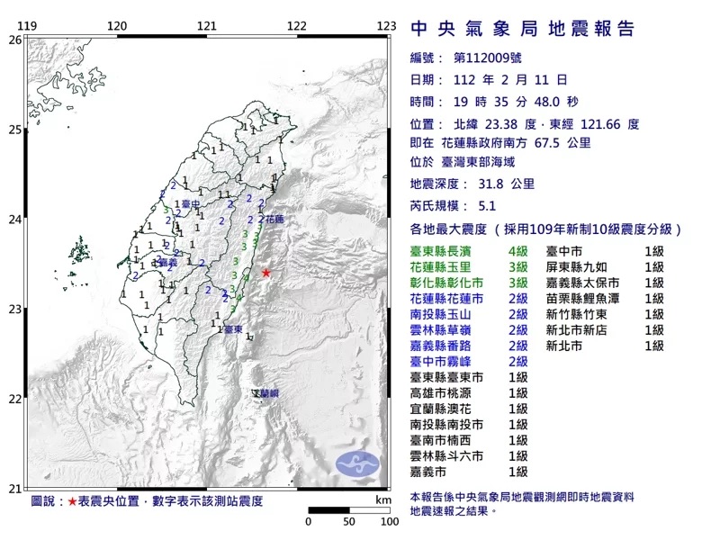晚間7:35東部規模5.1地震 最大震度4級 |2023.02.11 語音朗讀 1990觀看次 字級 大 中 小 台灣東部海域(星號處)11日晚間發生規模5.1地震。圖/中央氣象局網頁 【本報台北訊】中央氣象局表示,今天晚間7點35分花蓮發生芮氏規模5.1有感地震,最大震度4級,震央位於花蓮縣政府南方67.5公里的台灣東部海域,地震深度31.8公里。各地震度(級):台東縣地區最大震度4級,花蓮縣、彰化縣地區最大震度3級,南投縣、雲林縣、嘉義縣、台中市地區最大震度2級,高雄市、宜蘭縣、台南市、嘉義市、屏東縣、苗栗縣、新竹縣、新北市地區最大震度1級。 前一篇文章 學測成績月底揭曉 升學專家建議先做2件事 下一篇文章 外送員 3年爆增10萬人 熱門新聞 01《化為千手》醫者路 黃致錕為病友證婚2026.02.1402純真博物館 重現書中世界2026.02.1503澳洲荒野 打造減碳儲能系統2026.02.1404【聊聊心裡事】內耗,是因心裡有兩隻貓在打架2026.02.1405星雲大師全集⑳【佛教管理學③】弘法系列人事篇 人事管理法③2026.02.1406嘉年華狂歡2026.02.1507日本出動4船圍捕 扣押大陸漁船2026.02.1408禁用娃娃兵日 哥倫比亞響應2026.02.14099天春節連假展開 湧返鄉人潮2026.02.1410全球馬博物館巡遊 見證文明史 2026.02.15 訂閱電子報 台北市 天氣預報 台灣一週天氣預報 相關報導 兩虎依偎 歡度情人節南投奧萬大 山櫻花綻放春節出國潮 桃機湧16.9萬人創高卡比胖拉提燈 亮相經典賽熱身 中華隊首戰險勝雄鷹9天春節連假展開 湧返鄉人潮