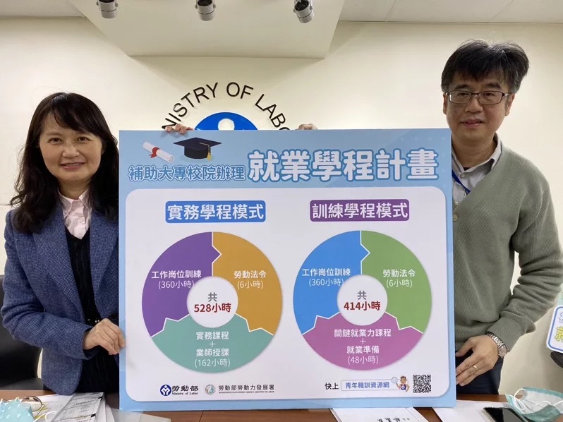 勞動部勞動力發展署訓練組組長沈文麗指出,大專院校自民國92年開辦就業學程,迄今已有72所學校、1千多家企業加入合作,每年約2萬名學生選修,就業率約8成。勞動部近期修正就業學程計畫,編列2.4億元,導入業師、工作崗位訓練(On-the-Job-Training)及關鍵就業力課程,並結合首度推動的「大專青年預聘計畫」,透過補助學校辦理學程經費及企業辦訓費用,鼓勵學校及企業加入。