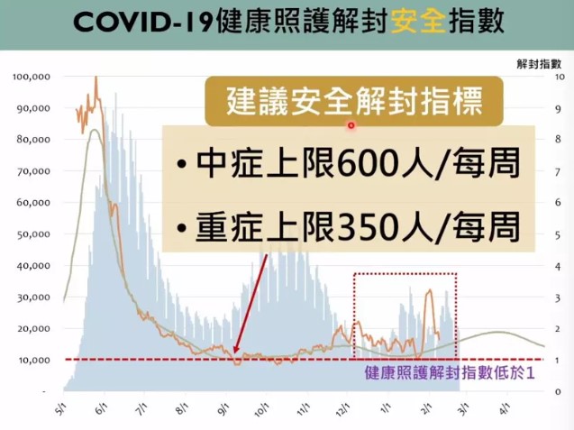 考量醫療量能、中重症監測、群體免疫、疫苗施打情形、新型亞變種病毒威脅等多項因素,陳秀熙推估,若每周中症不超過600人且重症不超過350人,即可達到安全解封指數,估4到6月間可達標、恢復新常態生活。