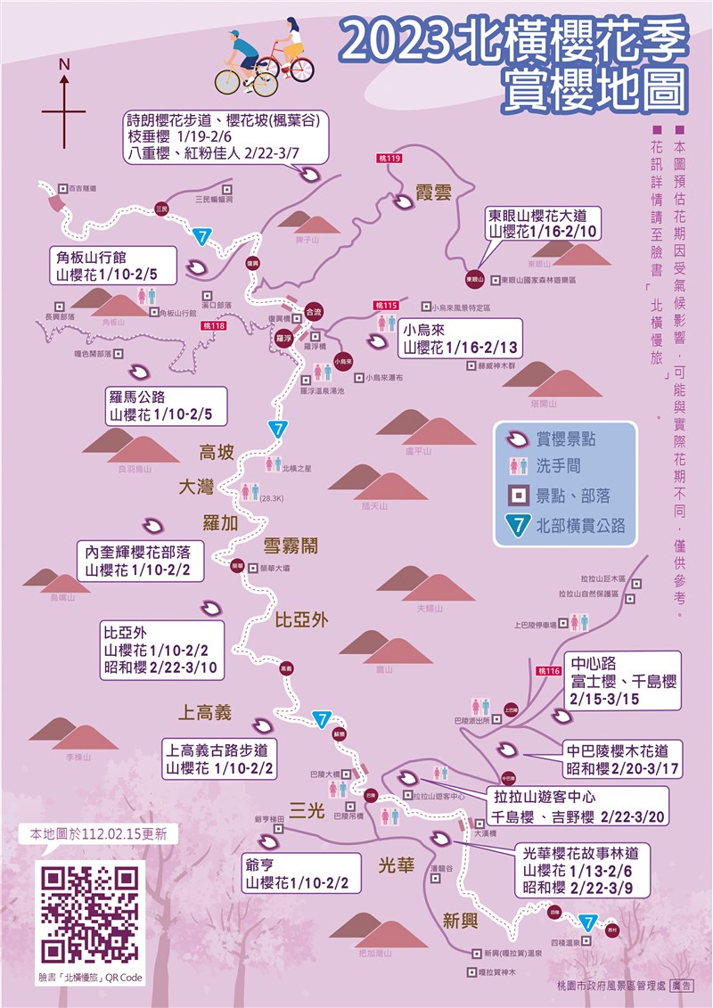 北橫櫻花季 新推賞櫻地圖、櫻花勇士完騎 |2023.02.15 語音朗讀 1084觀看次 字級 大 中 小 北橫櫻花季來了,復興區台7線、民宿農場多處景點櫻花盛開吸睛。圖/曾增勳北橫櫻花季來了,復興區台7線景點櫻花盛開,大溪警方疏導交通管制避免塞車。圖/曾增勳翻攝 【本報桃園訊】桃園市復興山區櫻花陸續綻放,今年北橫櫻花季今天起至3月15日,遊客沿台7線前往巴陵、拉拉山等地可看到櫻花盛開,市府觀旅局今天下午表示,為方便遊客賞櫻,該局推出今年北橫櫻花地圖,新推2023櫻花勇士單車完騎認證活動,預定17日開放線上報名。北橫櫻花季來了,預料至周休假日及228連假將吸引大量遊客、車潮前往北橫賞櫻, 大溪分局為避免塞車,櫻花季為期一個月中,警方表示,為避免大量遊客上山賞櫻熱門景點塞車,包括復興區台7線沿線、桃116線、中巴陵櫻花步道及上巴陵恩愛農場賞櫻路段,大溪警分局實施有效交通疏導及管制措施,市府觀旅局風景管理處推薦今年北橫賞櫻去處,遊客可以今年賞櫻地圖出遊,今天至3月15日,復興區上巴陵中心路及鄰近恩愛農場民宿景點,欣賞富士櫻、千島櫻;2月20日至3月17日可至復興區中巴陵櫻木花道,欣賞昭和櫻;自2月22日至3月20日期間,可前往拉拉山遊客中心欣賞千島櫻與吉野櫻,目前榮華派出所旁及慈湖停車場附近也是櫻花茂盛好看。觀旅局配合北橫櫻花季活動,新推出2023櫻花勇士單車完騎認證活動,預定2月17日上午9時起,開放民眾線上報名,歡迎喜愛騎單車的車友踴躍報名,風景區管理處並自今天起至3月10日規畫免費賞櫻接駁專車,緩解賞櫻期間人潮、車潮壅塞,歡迎上山賞櫻遊客多多利用輕鬆賞櫻。大溪警方表示,預估周休假日將出現賞櫻人潮、車潮,警方至3月15日櫻花季期間,實施交通疏導措施,遊客車輛沿台7線接桃116線往中心路、恩愛農場路段,採取進出整點放行,車輛太多則疏導至上巴陵停車場,避免桃116線塞車回堵,希望遊客配合交通指揮疏導。北橫櫻花季來了,市府觀旅局提供賞櫻地圖,遊客在櫻花季賞櫻遊玩一覽無遺。圖/曾增勳翻攝北橫櫻花季來了,復興區華榮派出所旁櫻花茂盛十分嬌豔。圖/曾增勳北橫櫻花季來了,復興區台7線沿路景點櫻花盛開。圖/曾增勳 前一篇文章 台灣國際蘭展將登場 網路抽獎送門票 下一篇文章 拋棄繼承前三思! 配偶放棄留給兒女 遺產稅暴增 熱門新聞 01動物的精采瞬間(下)2026.02.2202房市冷 仲介業跨足都更危老整合2026.02.2103朝山叩鐘 佛光山嶄新大雄寶殿迎春 2026.02.2104佛光山平安燈會 逾百萬人朝聖2026.02.2305光照大千璀璨登場 點亮和諧共生新希望2026.02.2106台北道場 新春禮千佛2026.02.2107Q版初代超人力霸王 領航愛河灣2026.02.2108【詩】紅豆控的紅龜粿2026.02.2309南投燈會 佛光山鳳凰主燈傳送光明2026.02.2110陸AI機器人秀功夫 驚豔全球2026.02.21 訂閱電子報 台北市 天氣預報 台灣一週天氣預報 相關報導 ASML技術增晶圓產量 台積受益士林官邸 浪漫滿園春節國旅日均73萬人次 成長109%千里眼山 步道重啟后里櫻花盛放屏東燈節 點亮南台灣