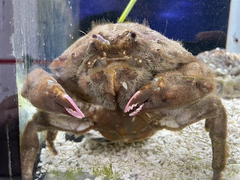 產學交流組主任 陳麗淑博士表示,綿蟹有非常特殊的生態行為,成體的綿蟹在其堅硬的外殼上布滿一層細密的毛,整隻看起來毛茸茸的,大螯前端鮮豔像是擦了粉紅指甲油,身體的絨毛觸感非常有趣,在天然海域中就像是顆長滿海藻的石頭。
