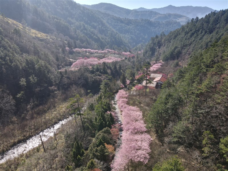 【本報台中訊】武陵農場今天(17日)宣布,即日起到21日都是園內盛花期,一早團隊以空拍機拍攝,綿延在溪水旁的粉紅佳人已盛開,3公里浪漫帶狀粉色相當壯觀;福壽山農場千櫻園已開放參觀,目前開花率不到五成,農場呼籲遊客難心等候「櫻花睡醒」。