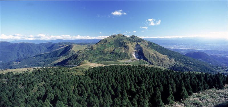 七星山上的小油坑(圖中),是一處後火山活動地質景觀區,位於七星山的西北麓,海拔約805公尺,當地有「後火山作用」所形成的噴氣孔、硫磺結晶、溫泉及壯觀的崩塌地形。圖/陽明山國家公園提供