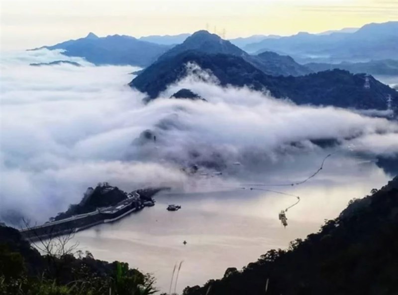 【本報桃園訊】桃園市石門水庫本月12日出現罕見雲海,今(19)日早上又因天氣因素出現雲海,層層迷濛雲霧籠罩水庫壩頂之上,十分美麗,水利署北區水資源局副局長郭耀程說,「人在現場,感覺雲海很明顯」,石門水庫出現雲海十分少見,感覺有如仙境。