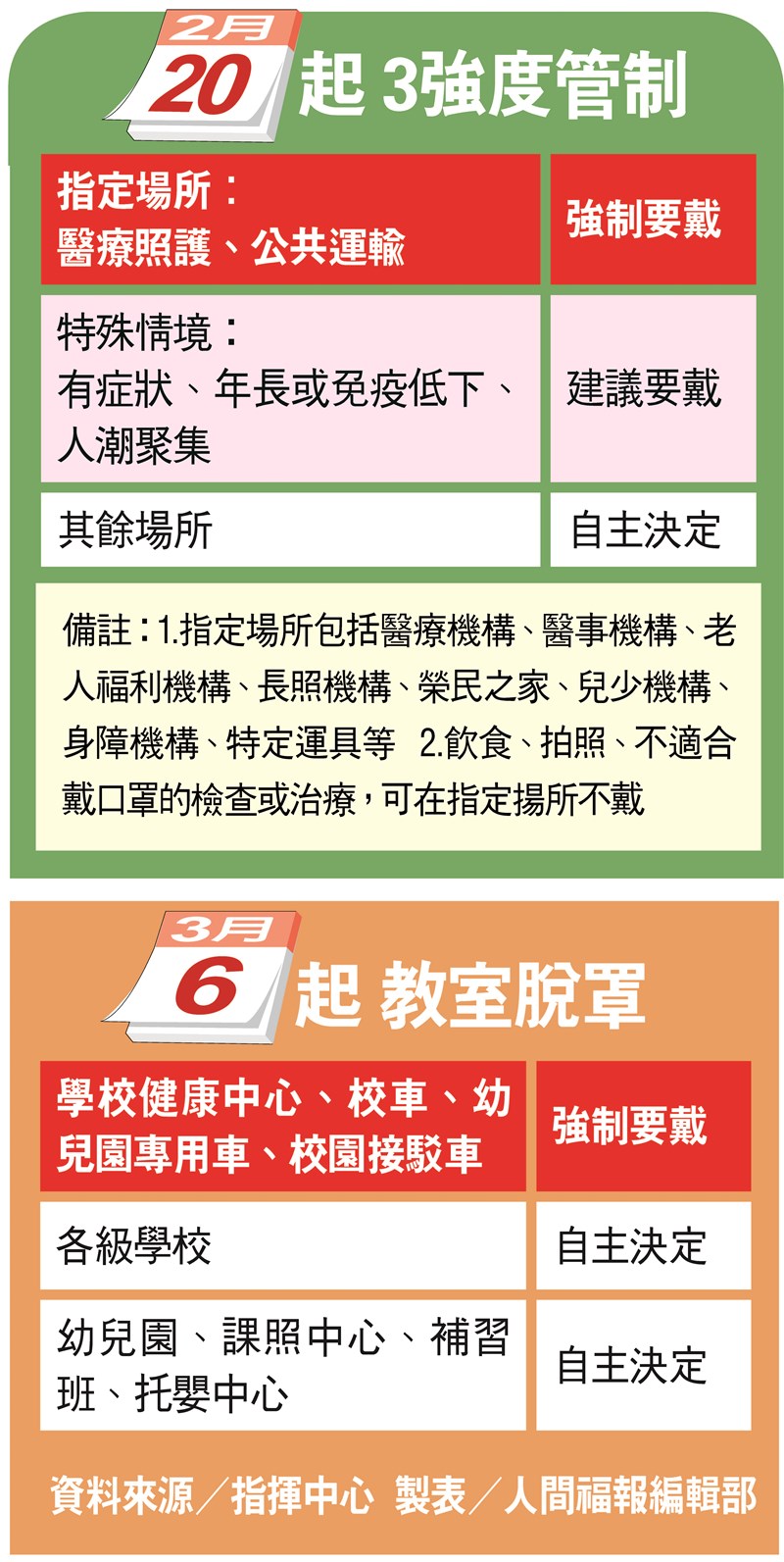 2/20室內口罩解禁 校園3月6日上路 |2023.02.19 語音朗讀 2081觀看次 字級 大 中 小 指揮中心日前宣布,預計自2月20日實施室內戴口罩規定放寬規畫,醫療照護及公共運輸等2大類指定場所,仍需「強制配戴」,校園室內口罩令則延至3月6日上路。圖/中央社 【本報綜合報導】國內疫情逐漸平穩,醫療量能充足,中央流行疫情指揮中心日前宣布,預計自2月20日實施室內戴口罩規定放寬規畫,醫療照護及公共運輸等2大類指定場所,仍需「強制配戴」,其餘採「建議」或「自主」決定配戴,校園室內口罩令則因開學前後皆有連假,憂連假後恐增加染疫機率,校園延至3月6日上路。指揮中心表示,醫療照護、公共運輸等2大類指定場所「應戴」口罩,醫療照護機構包括:醫療、醫事、老人福利、長期照顧服務、兒少服務等;公共運輸及特殊運具包含雙鐵、捷運、客運等車廂、船舶和航空器等運輸工具及場站,但如需飲食、拍照,不適合戴口罩的檢查、治療或活動,則可不戴。另外,4大情境建議配戴口罩,例如有發燒或呼吸道症狀、年長或免疫力低下者、人潮壅擠或通風不良處、與脆弱族群密切接觸時,其餘則依照個人判斷是否配戴。圖/林伯東教育部近日發函公私立圖書館、社教館所、運動場館及游泳池等室內場所,2月20日起在室內可自主決定是否戴口罩;不過校園室內空間,則待月底連假後至3月6日起才會實施。有關校園防疫,考量各級學校開學前歷經春節連續假期及寒假,並於開學後接續228和平紀念日4天連續假期,為觀察學生健康狀況及進行校園環境整備工作,教育部將在開學後二至三周加強體溫監測、校園清潔消毒等防疫作業,定於3月6日起於各級學校、幼兒園、課後照顧中心、補習班,實施室內空間原則「自主佩戴口罩」措施。不過,各級學校健康中心、校車、幼兒園專用車、校園接駁車等比照醫療照護機構和公共運輸等指定場所的規定,仍「應戴口罩」,教育部也允許學校考量教學需求,各級學校經與學校師生充分溝通並取得共識後,可於具特殊性場域或授課有相關需求時,學校得自行決定採取佩戴口罩措施。 前一篇文章 油價再降 中油20日起汽、柴油各調降0.1元 下一篇文章 台灣燈會今晚落幕 主燈去留評估中 熱門新聞 01瑕疵品反爆紅 哭哭馬賣到缺貨2026.01.1402南亞偏鄉師參學新馬寺 交流創意教學法 2026.01.1403平價版人類洗澡機 預計年底開賣2026.01.1404日電鐵貴志站 任命第3代貓站長2026.01.1405新馬寺 佛光兒童歡喜入學禮2026.01.1306重慶川普紅不讓 談旅遊給人歡喜2026.01.1407菲律賓三好校園頒獎 129校獲表揚2026.01.1308金球獎提摩西夏勒梅封帝 蘿絲拜恩摘后2026.01.1309野森動物學校 17日試營運2026.01.1310台南林鳳營 落羽松花海2026.01.13 訂閱電子報 台北市 天氣預報 台灣一週天氣預報 相關報導 汪喵嘉年華 總統籲零棄養高雄新材料循環產業園區台半導體供應鏈 4成移美歷來最大手筆 台積今年資本支出 將逾500億美元台電技能競賽 1281名好手展技蔣經國逝世38周年 鄭麗文頭寮謁陵