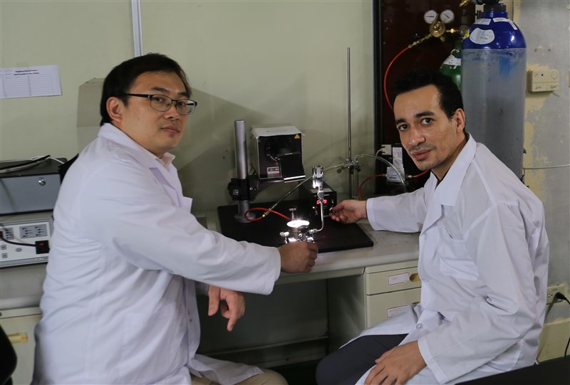 中山大學光電工程學系助理教授李炫錫(左)帶領「奈米能源與界面實驗室」與學生何莫善(右)研究光能轉換及應用科學。圖/中山大學提供