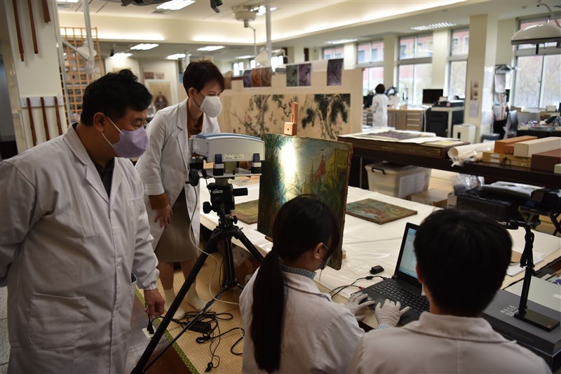 台師大文保中心主任張元鳳、美術系教授林震煌、資深修復師潘怡伶現場操作光學儀器進行科學檢測。圖/台師大提供
