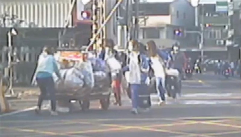 彰化市長順街平交道20日下午發生驚險一幕,95歲拾荒陳姓阿嬤與推車卡在平交道,就在最危險時,3名國中生和女子突跑過來幫忙阿嬤推車,才化除危機。圖/民眾提供