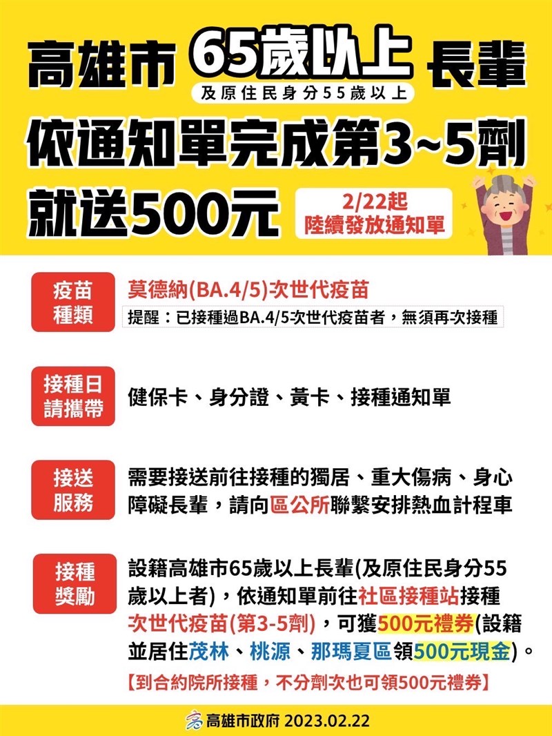 高市府發布新聞稿指出,65歲以上是染疫後相對風險較高的族群,打疫苗是預防重症死亡最好的方式,呼籲市民與長輩接種疫苗,而高雄市65歲以上長者,凡於2月24至3月20日期間接種疫苗,不分劑次都獎勵500元禮券或現金。