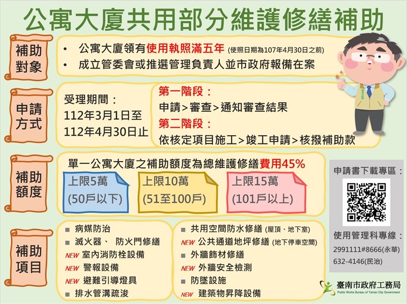 【本報台南訊】台南市政府今天(23日)公告「公寓大廈共用部分維護修繕補助」,自3月1日至4月30日受理申請;2022年總預算200萬元今年提高至500萬元,補助額度為總維護修繕費用45%,視戶數規模補助上限5至15萬元,今年擴大補助項目範圍,新增「警報設備」 等6項補助。