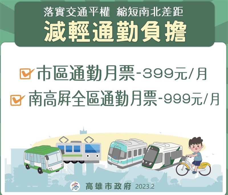 市府強調,市區通勤月票將由1250元降價到每月399元,高雄市民可以用399元票價享受無限次使用高雄市境內捷運、公車、輕軌、渡輪及公共自行車等,尤其公車部分,包含原公路客運移撥路線,大幅降低旗美9區及北高雄民眾通勤負擔。