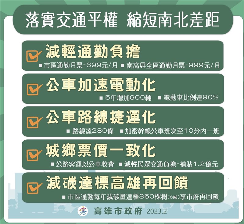 市府指出,為落實交通平權、縮短南北差距,未來高雄市公共運輸配套規畫有5大目標:減輕通勤族負擔(高雄市區通勤月票399元、南高屏通勤月票999元),公車加速電動化(5年增加900輛、電動車比例達90%)、公車路線捷運化(路線達280條、加密幹線公車至少10分鐘內一班),城鄉票價一致化(公路客運以公車收費、減輕民眾負擔-補貼1.2億元)。