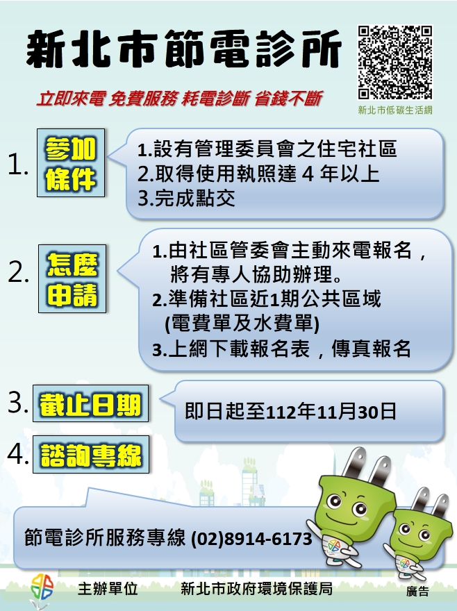 新北市環保局說,可申請節電專家到社區健檢,提供改造補助最高30萬,並補助電動車公共充電設備每座1萬、公共線槽1車位補助1000元。