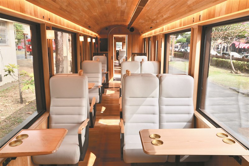 阿里山鐵路檜木車廂「福森號」全新亮相,車廂內裝的弧形天花板、地板、牆面、桌板與座椅扶手,都以檜木製成,乘客可觸摸到檜木的溫潤質感。圖/阿里山林鐵及文資處提供