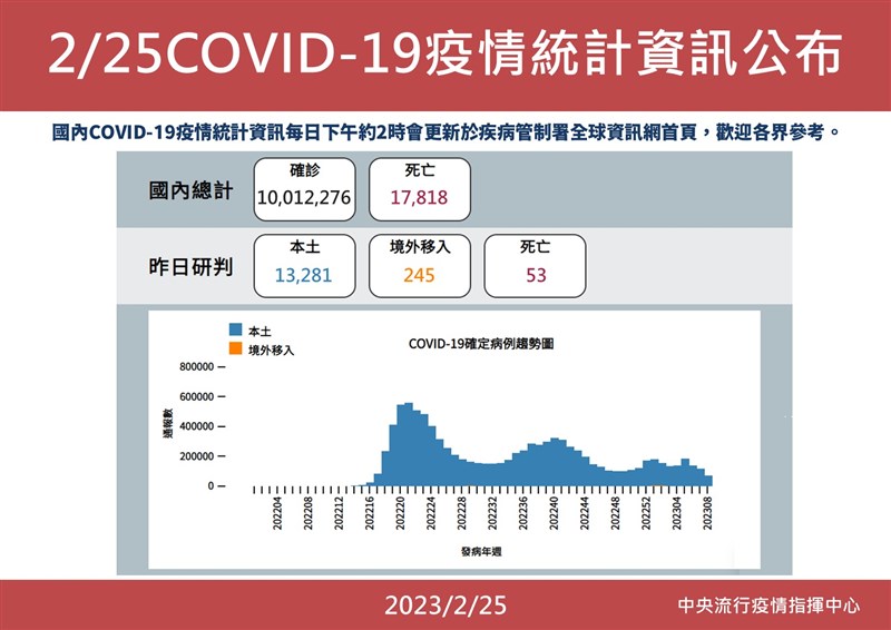 新冠疫情延燒3年 確診累積病例破千萬 |2023.02.25 語音朗讀 1214觀看次 字級 大 中 小 自2020年國內出現首例新冠病例至今,確診累積病例已破千萬。圖為民眾進行快篩。圖/資料照片 【本報台北訊】中央流行疫情指揮中心今(25日)公布新冠病毒疫情統計,25日新增1萬3281例本土確定病例,245例境外移入,另確診個案中新增53例死亡;國內目前有1001萬2276例確診病例,自2020年國內首例新冠病例出現至今,累積超過破千萬名病例。指揮中心發言人羅一鈞表示,25日相較上周六2月18日新增1萬4795例,降幅10.2%,累積死亡病例達1萬7818例。室內口罩規定日前鬆綁,今起為228連假,羅一鈞提醒,民眾出遊有碰到4類情況,仍建議戴口罩,包括有發燒或呼吸道症狀、年長者或免疫低下者外出時、人潮聚集且無法保持適當距離或通風不良之場合、與年長者或免疫低下者(尤其未完整接疫苗者)密切接觸時。另外,羅一鈞提醒,目前室內仍規定要戴口罩的場所,包括醫療照護機構、公共運輸及特殊運具如車廂、船舶、航空器等,民眾搭遊覽車、計程車時,也要記得配戴口罩。口罩禁令雖放寬,但搭乘大眾運輸工具時仍無法脫罩。圖/中央社指揮中心指出,因應民眾購買家用抗原快篩試劑之需求,宣布自今年3月1日起,實施第11輪家用抗原快篩試劑實名制,目前貨源穩定充足,民眾可持健保卡或居留證到藥局、衛生所購買,每輪民眾可購買1份5劑,購買份數至多可購買6份(30劑),每份5劑售價500元,可分次購買。至於第七輪0至6歲學齡前幼兒及第五輪65歲以上長者免費領取家用抗原快篩試劑部分,將如期至今年2月28日停止領取,請符合該輪資格尚未領取的民眾,儘快持健保卡領取。圖/指揮中心提供 前一篇文章 NBA/湯神再現! 2度飆進12記3分破紀錄 下一篇文章 NBA/魏少轉隊首戰 見證40年來最扯飆分秀 熱門新聞 01屏東.春日 太陽之子南島風 陶壺印記排灣情2026.01.2602【研朱札記】《臺灣文學》的 誕生地──山水亭2026.01.2703【藝象空間】內觀造景 哲人哲思 ──楊英風的大乘景觀2026.01.2504吃素好體力 霍諾德登頂101 2026.01.2605天元宮聯名幾米 邀您一起賞櫻花2026.01.2506【獻給動物朋友的詩】站成蘭花的螳螂與嘗到幸福滋味的蜂2026.01.2907【閃文集】獨特自主的貓咪2026.01.2708【紙粹的家】用故事說故事2026.01.2509澳網 辛納拚3連霸 小蠻牛盼全滿貫2026.01.3010【傳燈六十‧百年仰望】星雲大師一筆字書法紀念特展概述2026.01.30 訂閱電子報 台北市 天氣預報 台灣一週天氣預報 相關報導 魯比歐:習視統一為歷史使命陳菊辭監察院長 李鴻鈞代理睽違24年 央行啟動新台幣改版海鯤號6度海測 台船:安全無虞下交艦金門馬 逾千大陸跑者成亮點陸海警侵擾金門 海巡署強勢驅離